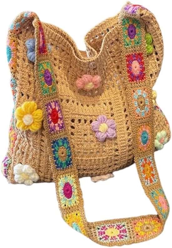 Women's shoulder bag - Embroidered bag - Handmade crocheted fabric bag - Colorful patterns - Perfect for shopping and holidays - Khaki